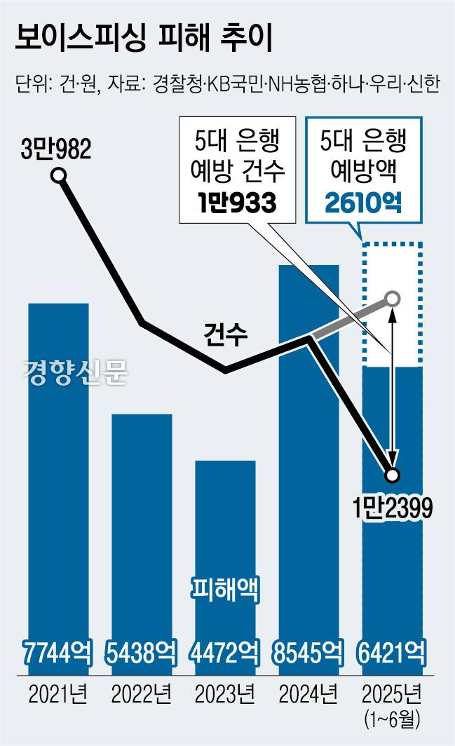 그간 은행들은 자체 이상거래탐지시스템 등을 활용해 보이스피싱 예방 활동을 벌여왔다. KB국민·NH농협·하나·신한·우리 등 5대 은행의 올해 상반기 보이스피싱 예방건수는 1만933건, 예방액은 2610억원이다.