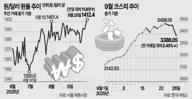 최근 환율 상승 요인이 주식시장에도 악재로 작용하고 있지만, 이번 조정이 추세적 하락으로 이어지진 않을 것으로 봤다. 나정환 NH투자증권 연구원은 “다음 주 발표될 9월 고용지표와 제조업지표가 예상보다 강할 경우 금리인하 속도가 늦춰질 수 있고, 이는 달러 강세 지속과 외국인 자금 이탈로 이어져 주가에 추가 부담을 줄 수 있다”며 “반대로 지표가 부진할 경우 연준의 인하 기대가 강화되며 환율 안정과 주가 반등의 계기가 될 수 있다”고 내다봤다.