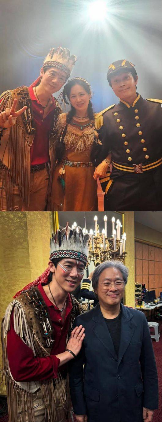 사진 속 유연석은 인디언 분장을 한 채 손예진, 이병헌과 포즈를 취했다. 또한 그는 '어쩔수가없다'를 연출한 박찬욱 감독과도 웃으며 돈독한 분위기를 자아냈다.