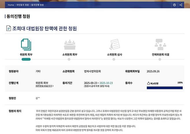 | ▲ 국민전자청원 홈페이지에 올라온 조희대 대법원장 탄핵 청원 |