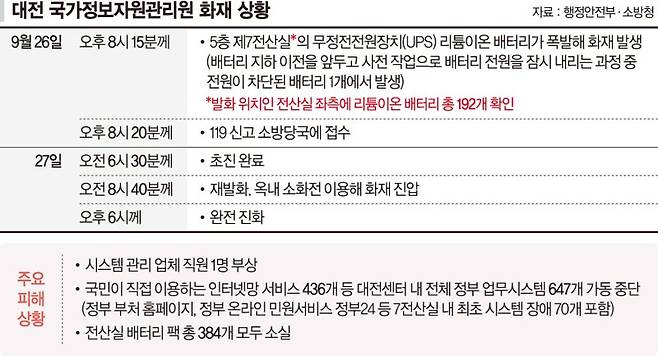 정부가 선제적 조치에 나설 수도 있다. 현재까지 국정자원 화재의 원인은 리튬이온 배터리 교체 작업 중 발생한 불꽃 또는 폭발로 추정된다. 배터리 권장 사용연한을 1년 넘겼고, 배터리를 옮기는 과정에서 작업자의 실수 가능성도 거론된다. 어느 쪽이라도 국가 정보기술(IT) 관리와 감독에 허점이 드러나는 셈이 된다.