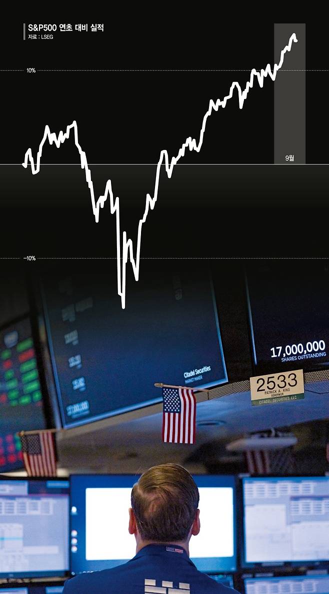 연준의 금리 인하 방침도 주가 상승에 불을 당겼다. 금리 하락은 기업 차입 비용을 낮추고 주식 밸류에이션을 끌어올리며, 안전자산에서 위험자산으로 자금 이동을 촉발했다. 올해 초만 해도 도널드 트럼프 대통령이 4월 '해방의 날(Liberation Day)' 관세를 발표하면서 경기침체 우려가 확산돼 주요 증권사들이 연말 목표치를 S&P 지수를 6000 이하로 낮춘 바 있다. 그러나 이후 관세 완화와 연준의 금리 인하 기대가 투자자들을 안심시키면서 경기침체 리스크는 줄었고, 주식시장은 사상 최고치 행진을 이어가고 있다.