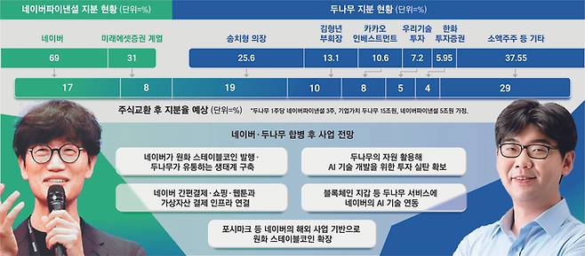28일 관련 업계에 따르면 현재 추진되는 네이버파이낸셜과 두나무의 결합은 각 분야(인터넷 플랫폼과 가상자산 거래소)의 국내 1위 주자들이 미래 성장을 도모하겠다는 두 수장(이해진 네이버 창업자 겸 이사회 의장·송치형 두나무 이사회 의장)의 강력한 의지가 작용한 결과다.