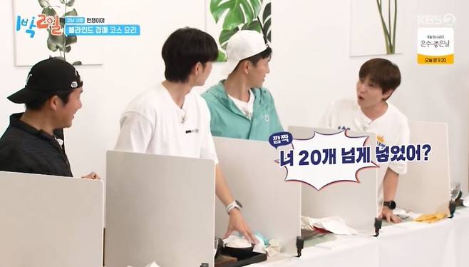 이날 멤버들은 특별한 저녁 식사를 먹게 됐다. 바로 블라인드 경매 코스 요리로, 먹고 싶은 요리가 나오면 트레이에 엽전을 올려 입찰하는 미션이었다. 낙찰이 되지 않더라도, 한번 제출한 엽전은 회수한다고. 김종민이 책상을 슬쩍 염탐하자 딘딘은 "왜 봐"라고 발끈했다. 이에 조세호는 "몰래 보면 10개씩 회수하자"라고 했고, 제작진은 이를 수용했다. 김종민은 "갑자기 너무 궁금해"라며 애타는 마음을 드러냈다.