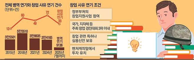 하지만 창업을 사유로 입대를 연기하려면 △정부부처의 창업지원사업 참여 △국가, 지방자치단체, 공공기관 주최 창업 경진대회 3위 이내 입상 △창업 관련 특허나 실용신안 보유 △벤처캐피털에서 투자 유치 등 상당히 까다로운 조건을 만족시켜야 한다. 또 최장 2년까지밖에 입영일자를 연기할 수 없는 것도 실효성이 떨어진다는 지적이다.