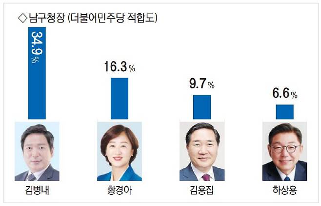 광주 남구청장 민주당 후보 적합도 조사 결과 김병내 현 청장이 34.9%로 가장 높은 지지를 받았고 황경아 전 남구의회 의장이 16.3%로 2위를 차지했다. 이어 김용집 전 광주시의회 의장 9.7%, 하상용 전 빅마트 대표 6.6% 등 순이다.