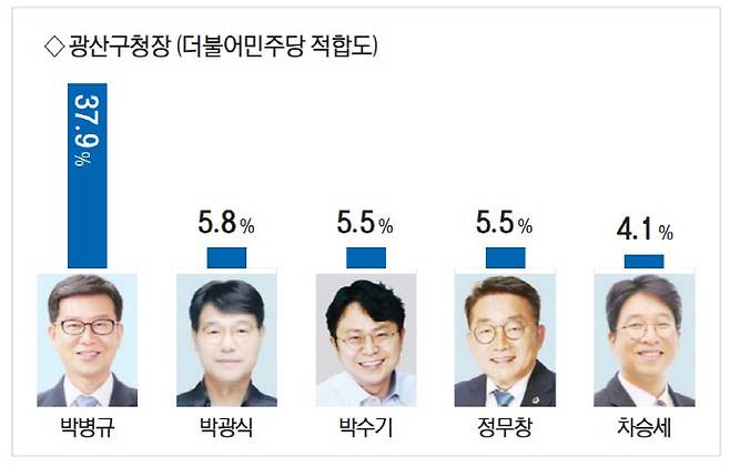 광산구청장 민주당 후보 적합도 조사에서는 박병규 현 청장이 37.9%로 가장 높은 지지를 얻었다. 박광식 전 광산구청 정무비서실장 5.8%, 박수기 광주시의원 5.5%, 정무창 전 광주시의회 의장 5.5%, 차승세 전 광주시 정무특별보좌관 4.1% 등으로 나타났다. '적합한 후보가 없다' 응답은 14.8%', '모름' 23.3%로 부동층이 38.1%에 달했다.