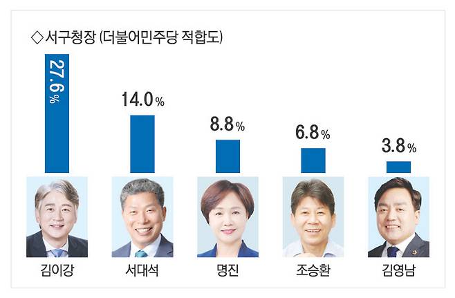 광주 서구청장 민주당 후보 적합도 조사에서 김이강 현 청장이 27.6%로 오차범위 밖 1위를 차지했다. 서대석 전 청장이 14.0%, 명진 광주시의원 8.8%, 조승환 전 서구청 총무국장 6.8%, 김영남 전 광주시의원 3.8% 순으로 나타났다