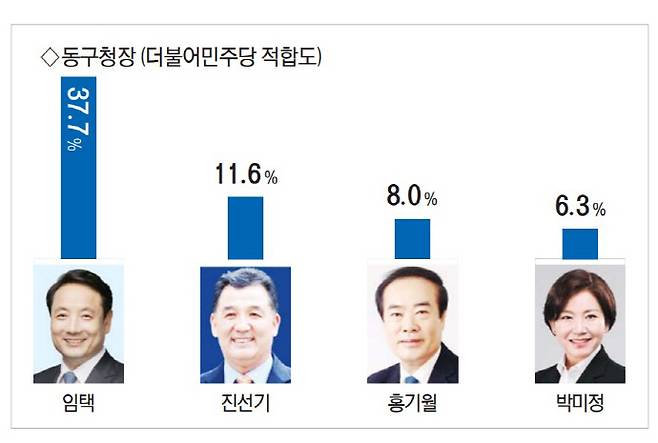 광주 동구청장 민주당 후보 적합도 조사 결과 임택 현 청장이 37.7%로 선두를 차지하며 11.6%에 그친 진선기 전 광주시의회 부의장을 26.1%p 큰 격차로 따돌렸다. 홍기월 광주시의원 8.0%, 박미정 광주시의원 6.3%로 뒤를 이었다.