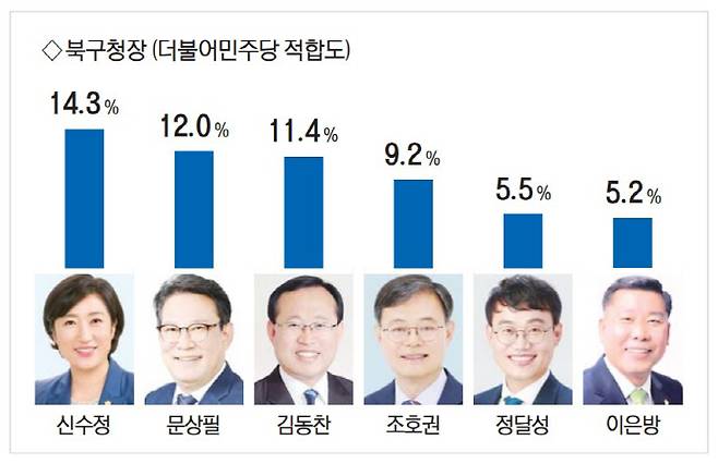 광주 북구청장 민주당 후보 적합도 조사에서는 신수정 광주시의회 의장이 14.3%로 오차범위 내 선두를 차지했다. 문상필 전 광주시의원 12.0%, 김동찬 전 광주시의회 의장 11.4%, 조호권 전 광주시의회 의장이 9.2%를 차지하며 추격에 나서고 있다. 이어 정달성 북구의원(5.5%), 이은방 전 광주시의회 의장(5.2%) 순으로 집계됐다.