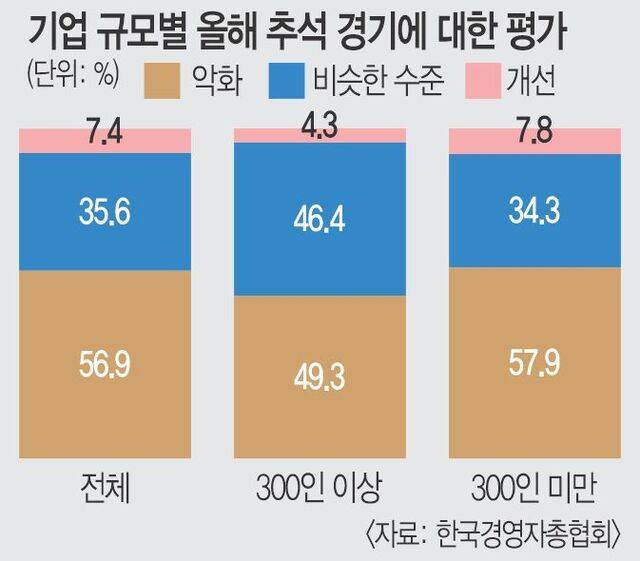 한국경영자총협회는 전국 5인 이상 625개 기업을 대상으로 ‘2025년 추석 휴무 실태조사’를 실시한 결과 이같이 나타났다고 28일 밝혔다. 응답 기업의 56.9%는 추석 경기가 지난해보다 악화됐다고 답했다. 경기가 나아졌다고 답한 기업은 7.4%에 그쳤다. 기업 규모별로 보면 ‘지난해보다 악화됐다’는 응답은 300인 미만 기업이 57.9%로 300인 이상 기업(49.3%)보다 8.6%포인트 높게 나타났다.