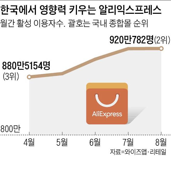 리테일 분석 서비스 와이즈앱·리테일에 따르면 지난달 알리익스프레스의 월간 활성 이용자(한 달에 한 번 이상 앱에 접속한 사용자)는 920만782명에 달한다. 쿠팡에 이어 국내 종합몰 순위 2위다. 알리익스프레스는 지난 12개월 동안 4월과 5월에 3위를 기록한 걸 제외하면 모두 2위를 기록했다. 올 1~8월 알리익스프레스의 평균 월간 활성 이용자 수는 901만813명에 달한다.