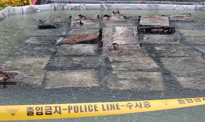 | “재발화를 막아라”… 소화 수조에 담긴 리튬이온 배터리들 28일 대전 유성구 국가정보자원관리원 본원 화재 현장에 전소된 리튬이온 배터리들이 소화 수조에 담겨 있다. 화재 현장에서 배터리 384개 반출을 완료한 당국은 폐배터리의 추가 발화를 막기 위해 2∼3일 수조에 담궈놓기로 했다. 대전=뉴스1 |