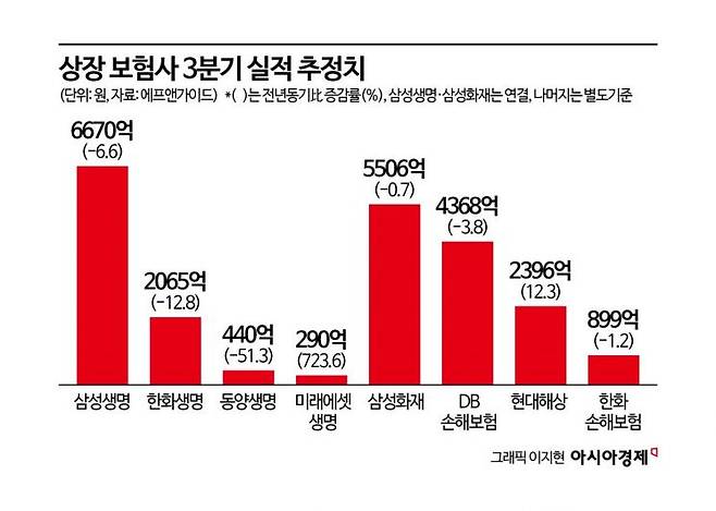 29일 금융정보업체 에프앤가이드에 따르면 국내 상장 보험사 8곳(삼성생명·한화생명·동양생명·미래에셋생명·삼성화재·현대해상·DB손해보험·한화손해보험)의 올해 3분기 당기순이익 컨센서스(시장 평균 전망치)는 2조2633억원으로 집계됐다. 지난해 3분기 순이익(2조3574억원)과 비교해 4% 줄어들 것이란 예상이다. 이 기간 업권별 순이익은 생보사가 9.4% 줄고 손보사는 0.3% 늘어날 것으로 예상됐다. 삼성생명과 삼성화재는 연결기준, 나머지는 별도기준 추산치다.