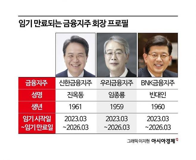 29일 금융권에 따르면 내년 3월 임기가 만료되는 곳은 신한지주, 우리금융지주, BNK금융지주다. 진옥동 신한지주 회장의 임기는 내년 3월26일, 임종룡 우리금융지주 회장과 빈대인 BNK금융지주 회장의 임기는 각각 3월31일까지다. 이 가운데 가장 먼저 움직인 곳은 신한지주다. 신한지주 회장후보추천위원회(회추위)는 지난 26일 회의를 열고 차기 대표이사 회장 후보 선정을 위한 경영 승계 절차를 개시했다고 밝혔다.