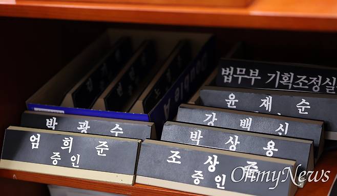 | ▲ 22일 국회 법제사법위원회 회의실에 검찰개혁 입법청문회 증인으로 채택된 검사들의 명패가 준비돼 있다. |