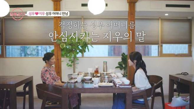 다음 날, 성우X지우는 성우의 어머니를 만나러 갔다. 한식당에 미리 도착한 성우는 지우에게 “우리 엄마가 사실 대장부 같은 스타일이라, 말을 세게 하실까 봐”라며 걱정했다. 잠시 후 성우의 어머니가 찾아왔고, 우려와 달리 어머니는 지우와 편안한 분위기에서 식사를 했다. 성우 어머니는 서로에게 꿀이 뚝뚝 떨어지는 성우X지우의 모습에 흐뭇한 미소를 지었고, “성우의 얼굴이 너무 밝아져서 마음이 편하다”라고 지우에게 고마워했다.