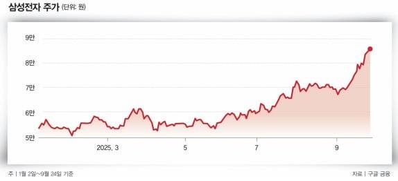 9월 23일 삼성전자 주주들이 온라인 커뮤니티에 올린 게시 글들이다. 삼성전자 주가는 9월 18일 1년 1개월 만에 8만 원 선을 넘기고 25일까지 연일 52주 신고가를 갈아치웠다(그래프 참조). 24일 8만5400원에 장을 마치며 종가 기준으로 9월에만 22.53%(1만5700원) 오른 상태다.