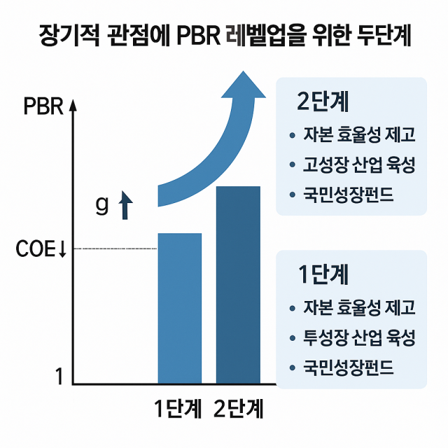 2단계 PBR 상승 시기에 필요한 전략은, 자사주 소각과 적정 배당정책으로 자본 효율성을 높이고, 반도체, 바이오, 친환경 모빌리티 등 고성장 산업을 집중 육성하는 것이다. AI 기반의 생산성 혁신과 AX의 전방위적 확산을 통해 장기이익성장률(g)을 끌어 올려야 한다. 정부, 공적금융기관, 민간 등이 공동으로 출자하는 국민성장펀드가 장기성장 기반을 만드는 핵심 역할을 할 것이다. 국민성장펀드는 정부가 후순위 및 손실보장을 제공하고 민간 금융기관의 LP 참여 시 투자 위험계수를 낮추는 방식이 확대 적용되어야 한다. 이러한 구조가 마련되면 국민성장펀드가 AI와 첨단산업으로 장기 모험자본을 공급해 g를 끌어올리면서 PBR이 2차 상승할 수 있을 것이다.