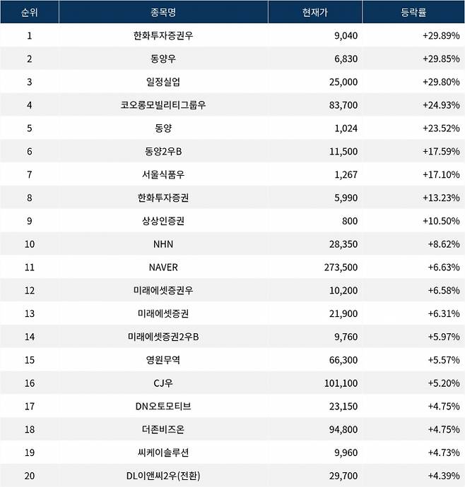 [서울데이터랩]‘한화투자증권우’ 29.89% 상한가…실시간 상승률 1위