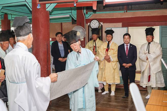 제례 봉행에는 △초헌관 이도경 삼도프레스 대표 △아헌관 이도생 고성향교 유림 △종헌관 한홍조 고성향교 유림이 참여해 관례에 따라 예복을 갖추고 성현들의 위패 앞에 헌작하며 공경을 표했다.