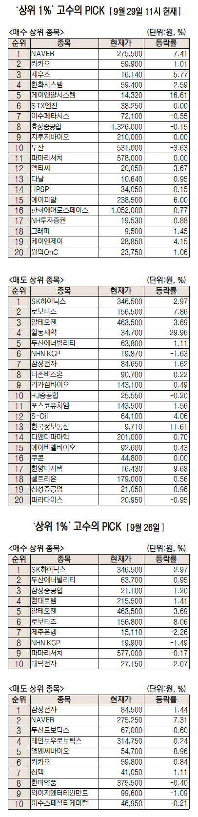 이날 미래에셋증권에 따르면 미래에셋증권 주식 거래 고객 중 최근 1개월간 투자 수익률 상위 1%에 해당하는 ‘주식 초고수’들이 오전 11시까지 가장 많이 사들인 종목은 네이버다.