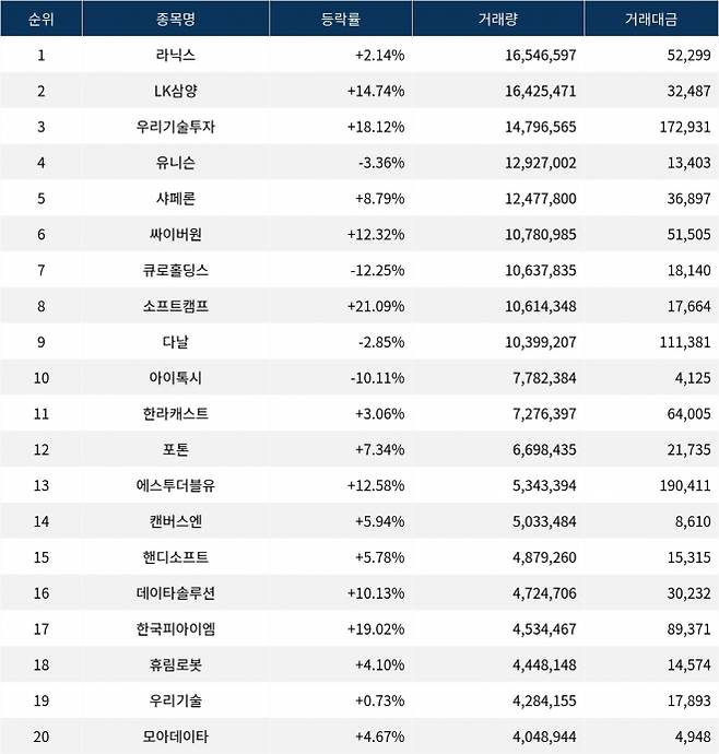 한편 거래량 상위 20위권 종목들은 한라캐스트(125490) ▲3.06%, 포톤(208710) ▲7.34%, 에스투더블유(488280) ▲12.58%, 캔버스엔(210120) ▲5.94%, 핸디소프트(220180) ▲5.78%, 데이타솔루션(263800) ▲10.13%, 한국피아이엠(448900) ▲19.02%, 휴림로봇(090710) ▲4.10%, 우리기술(032820) ▲0.73%, 모아데이타(288980) ▲4.67% 등의 성적을 기록했다.