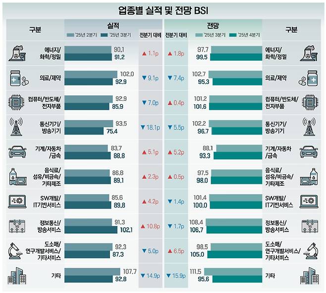 업종별로는 서비스업이 91.8로 전기(89.6)보다 상승하면서 지난해 조사 시작 이래 최고치를 경신했다. 세부 업종 중 정보통신·방송서비스는 102.1로 기준치(100)를 상회하기도 했다. 다만 제조업은 88.2로 전기(88.9) 대비 하락했다. 특히 통신기기·방송기기의 경우 75.4로 전기(93.5)보다 18.1포인트가 하락했다.
