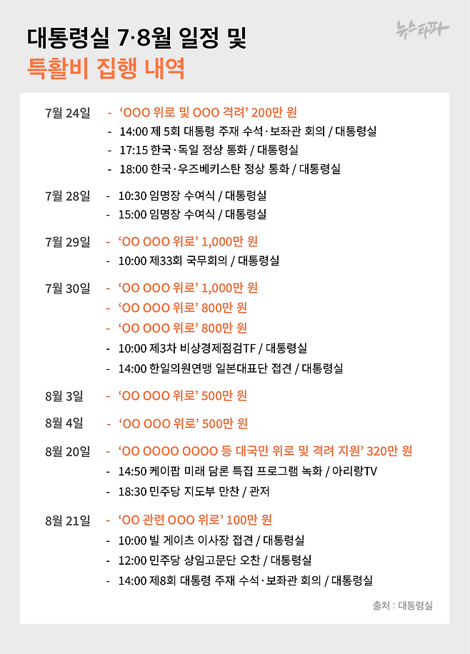 ‘위로금”, ‘격려금’ 특활비 지출일 대통령 공식 공개일정은 회의·식사