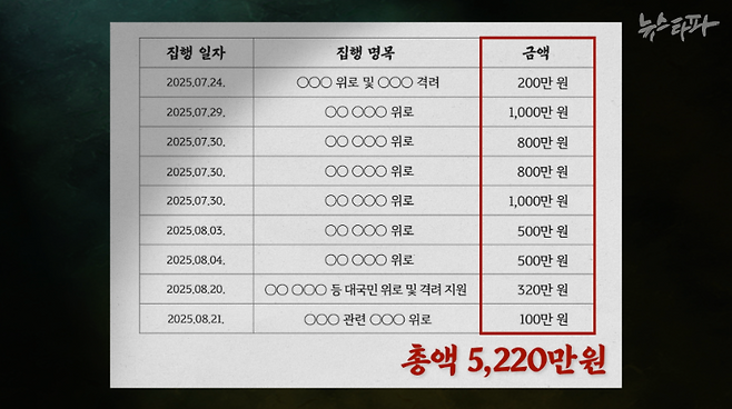 이재명 대통령실에서 위로, 격려 명목으로 집행한 특활비는 지난 7월 24일부터 8월 21일까지 약 한 달 사이에만 5,200여만 원에 이른다. 많게는 한 번에 1,000만 원의 특활비를 위로금 명목 아래 전액 현금으로 지급했다.