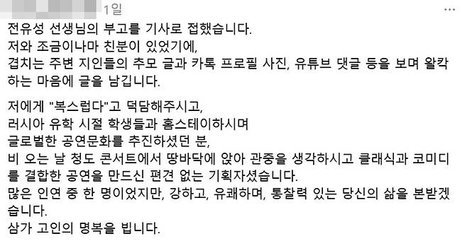 한 작성자는 전유성에 대해 "저에게 '복스럽다'고 덕담해주시고, 러시아 유학 시절 학생들과 홈스테이하시며 글로벌한 공연문화를 추진하셨던 분, 비 오는 날 청도 콘서트에서 땅바닥에 앉아 관중을 생각하시고 클래식과 코미디를 결합한 공연을 만드신 편견 없는 기획자셨다. 많은 인연 중 한 명이었지만, 강하고, 유쾌하며, 통찰력 있는 당신의 삶을 본받겠다"며 애도했다.