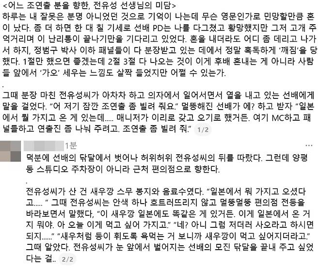 이어 "분장 마친 전유성 씨가 아차차 하고 의자에서 일어서면서 열을 내고 있는 선배에게 말을 걸었다. '일본에서 뭘 가지고 온 게 있는데 매니저가 이리로 갖고 오기로 했거든. 여기 MC하고 패널들하고 연출진 좀 나눠 주려고. 조연출 좀 빌려줘'라고 했다"며 "덕분에 선배의 닦달에서 벗어나 전유성 씨의 뒤를 따랐다. 근데 양평동 스튜디오 주차장이 아니라 근처 편의점으로 향했다"고 전했다.