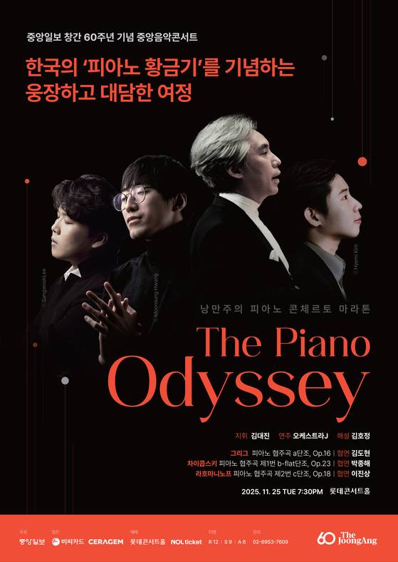 이진상·박종해·김도현이 함께 하는 ‘더 피아노 오디세이’는 11월 25일 오후 7시 30분 롯데콘서트홀에서 열린다. 중앙일보의 창간 60주년을 기념하는 공연으로, 50주년이 된 중앙음악콩쿠르의 수상자 위주로 구성된 오케스트라 J가 함께 한다. 피아니스트이자 지휘자인 김대진이 피아노를 가장 잘 아는 지휘자로서 세 곡의 거대한 작품을 이끈다. 이번 공연의 예매는 25일 시작됐으며 롯데콘서트홀, 놀티켓, BC카드 페이북 앱에서 예매가 가능하다. BC카드로 결제하는 고객에게는 15% 할인이 제공된다.