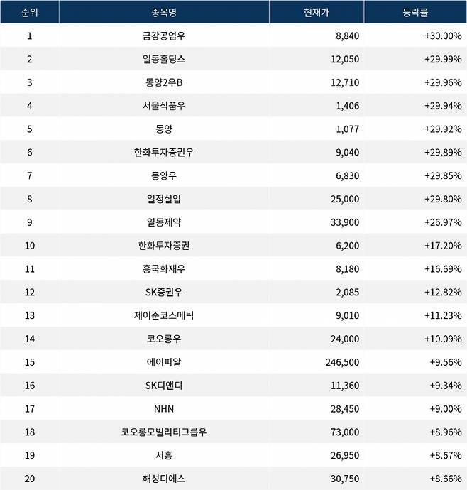 6위 한화투자증권우(003535)는 종가 9,040원으로 +29.89% 상승 마감했다. 7위 동양우(001525)는 종가 6,830원으로 +29.85% 상승 마감했다. 8위 일정실업(008500)은 종가 25,000원으로 +29.80% 상승 마감했다. 9위 일동제약(249420)은 종가 33,900원으로 +26.97% 상승 마감했다. 10위 한화투자증권(003530)은 종가 6,200원으로 +17.20% 상승 마감했다.