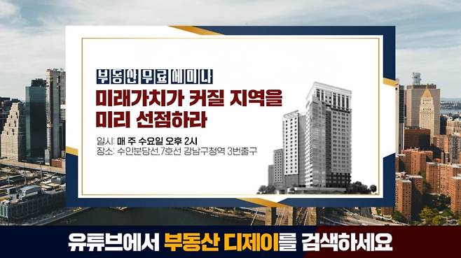 한편 부동산 무료세미나는 매주 수요일 오후 2시 선착순으로 진행되며 유튜브 채널 부동산디제이를 통해 신청할 수 있다.