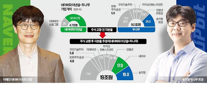 약 20조원에 이르는 네이버와 두나무 사이의 전례 없는 빅딜은 주주들의 복잡한 이해관계로 맞물려 있다. 주식 교환 비율과 적정 몸값을 둘러싸고 두나무 주주, 네이버파이낸셜 주주, 네이버 주주 세 축 간 보이지 않는 싸움이 추석 명절 이후로 치열하게 펼쳐질 전망이다.