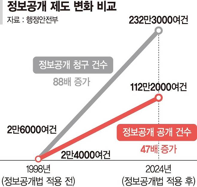 29일 행정안전부에 따르면 지난 27년간 정보공개 청구 건수는 88배, 공개 건수가 47배 증가한 것으로 나타났다. 지난 1998년 청구 건수는 2만6000여건에서 2024년 232만3000여건으로 88배, 공개 건수는 1998년 2만4000여건에서 지난해 112만2000여건으로 47배 증가했다.