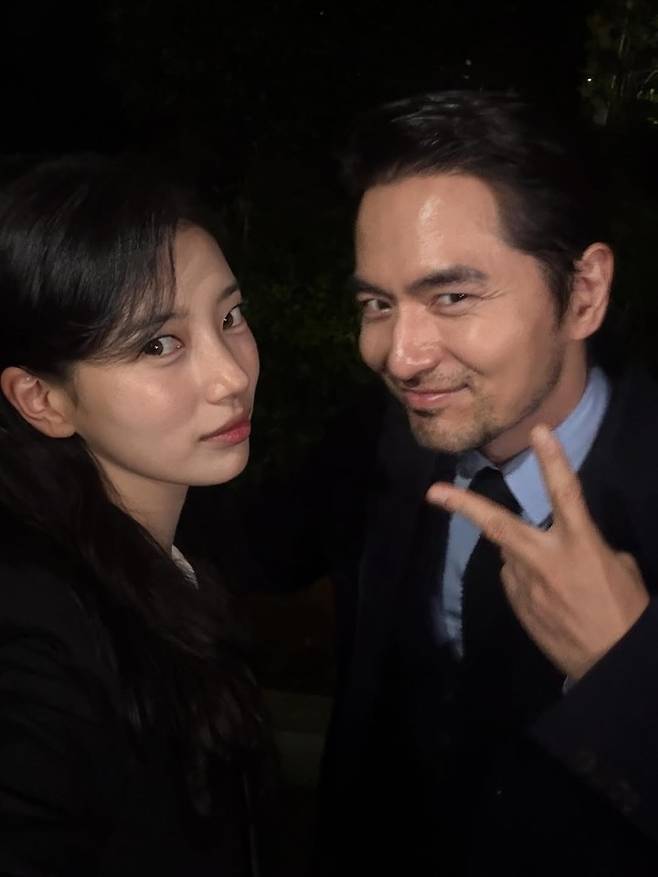 공개된 사진 속 수지는 블랙 수트에 실크 소재의 아이보리 블라우스를 매치해 단정하면서도 세련된 무드를 완성했다.