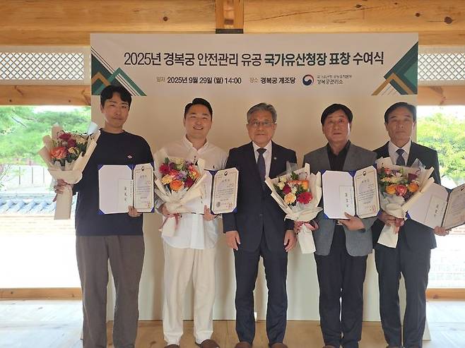 [서울=뉴시스] 최진석 기자 = 허민(가운데) 국가유산청장이 29일 오후 서울 종로구 경복궁 계조당에서 열린 경복궁 안전관리 유공 표창 수여식에 참석해 유공자들과 함께 기념촬영을 하고 있다. (사진=국가유산청 제공) 2025.09.29. photo@newsis.com *재판매 및 DB 금지