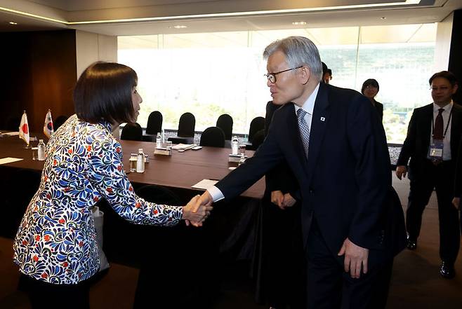 [서울=뉴시스] 최진석 기자 = 최동석 인사혁신처장이 29일 서울 중구 플라자호텔에서 카와모토 유코 일본 인사원 총재를 만나 인사를 나누고 있다. (사진=인사혁신처 제공) 2025.09.29. photo@newsis.com *재판매 및 DB 금지