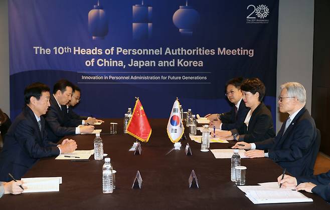 [서울=뉴시스] 최진석 기자 = 최동석 인사혁신처장이 29일 서울 중구 플라자호텔에서 치 찌아빈 중국 공산당 중앙조직부 부부장을 만나 인사행정 분야의 양국 협력방안에 대해 논의하고 있다. (사진=인사혁신처 제공) 2025.09.29. photo@newsis.com *재판매 및 DB 금지