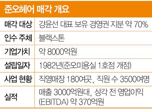 국내 미용실 프랜차이즈 준오헤어가 글로벌 사모펀드(PEF) 운용사 블랙스톤 품에 안겼다. 블랙스톤은 준오헤어에 대규모 투자와 상호 파트너십을 맺기 위한 주식매매계약(SPA)을 체결했다고 지난 9월 2일 발표했다. 양측 모두 구체적인 계약 규모와 구조는 밝히지 않았다. IB 업계에 따르면, 블랙스톤이 강 대표가 보유한 지분 약 70%를 사들인 것으로 전해진다. 지분 100%로 환산한 기업가치는 8000억원에 달한다.