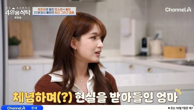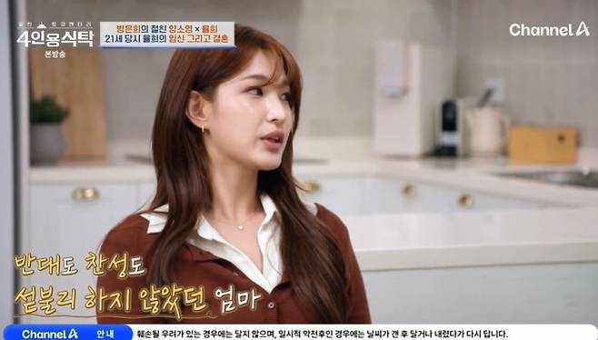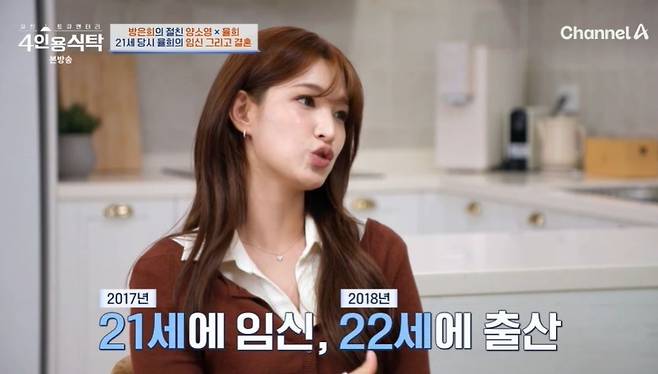 21세에 임신, 22세에 출산한 율희는 "전 제가 어른스럽다고 생각했다. 제가 한번은 속해서 울고 있는데, 저희 아기들한테 엄마가 '너희 엄마도 내 딸이다' 하더라"면서 울컥했던 당시를 떠올렸다. 율희는 "아이돌 활동하면서 외롭다는 느낌을 많이 받았다. 어린 나이에 아이들을 낳아서 육아를 더 잘해야 할 것 같았다. 엄마가 그 한마디 하셨을 때 기댈 수 있는 존재가 있는 것 같았다"라며 엄마를 향한 고마운 마음을 전했다. 율희 엄마가 74년생이란 걸 들은 양소영, 방은희는 "나보다 어려"라고 놀랐다.