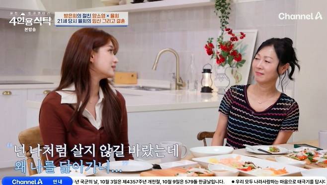 29일 방송된 채널A '절친 토큐멘터리-4인용 식탁'에서는 방은희, 율희, 양소영과 MC 박경림을 초대했다.