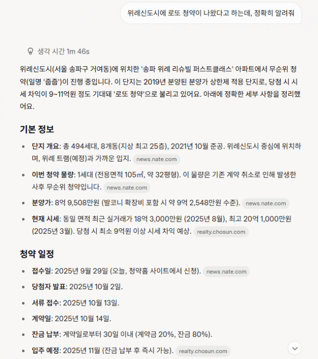 질문: 위례신도시에 로또 청약이 나왔다고 하는데, 정확히 알려줘