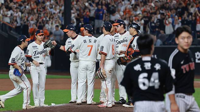 7-3으로 승리하며 LG의 정규시즌 우승 확정을 막아낸 한화 선수들이 승리를 자축하고 있다.