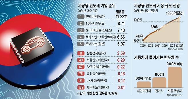 국내 차량용 반도체 생태계가 미약한 것은 높은 기술 및 품질 인증이라는 진입 장벽 때문이다. 인명과 직결되는 만큼 혹독한 주행 환경을 견딜 수 있는 내구성과 신뢰성이 필수적이다. 일반 반도체와 달리 다품종 소량 생산 구조라 사업성 확보도 쉽지 않다. 인피니언(독일), NXP(네덜란드), ST마이크로(스위스), 텍사스 인스트루먼트(미국), 르네사스(일본) 같은 전통의 ‘톱5’가 깊은 해자(垓字)를 구축한 채 사실상 시장을 장악하는 이유다.