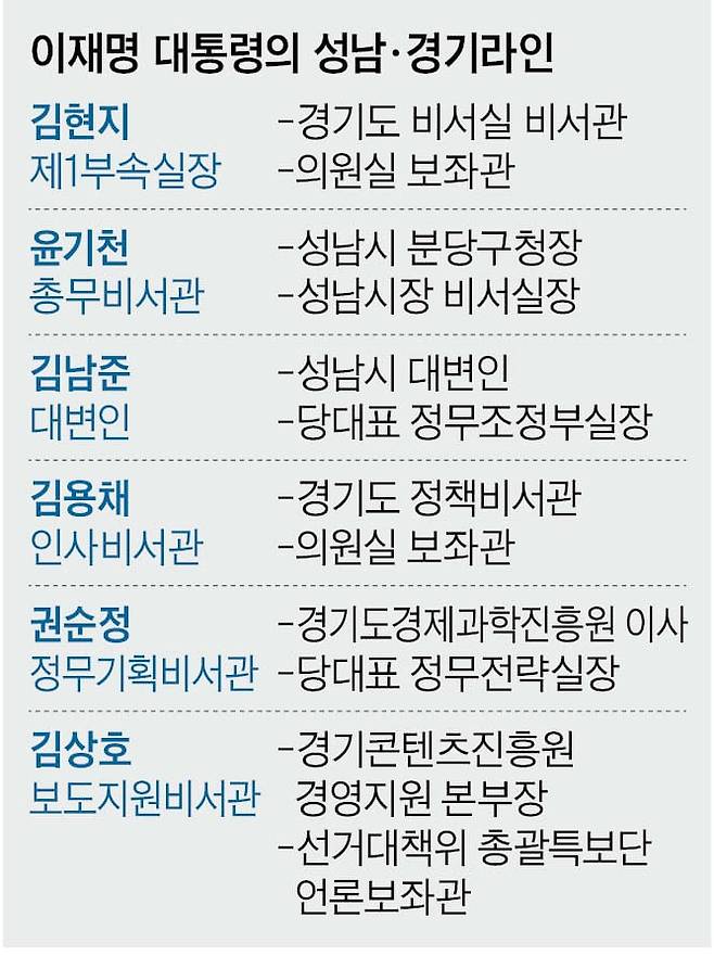 윤기천 제2부속실장은 김현지 비서관 자리였던 총무비서관으로 이동했다. 공석이 된 2부속실장은 당분간 비어 있을 것으로 보인다. 윤 실장은 이 대통령이 성남시장일 때 비서실장을 지냈고 이후 성남시 수정구청장과 분당구청장을 지낸 측근이다. 권순정 국정기획비서관은 신설한 정무기획비서관으로 자리를 옮겨 국회와의 소통을 담당하게 됐다. 성남·경기 라인 중엔 김용채 인사비서관만 그대로 자리를 지켰다. 한 여권 관계자는 “성남·경기 라인 핵심들이 기존 보직은 물론 대변인과 정무 라인까지 꿰차면서 영향력은 더 커진 모양새”라고 했다.