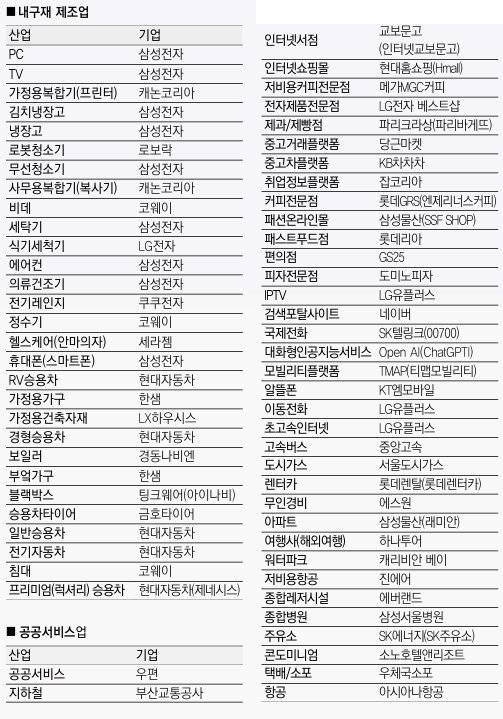 넷째, 27개 산업에서 1위 기업 변동이 나타나 역대 최다 기록을 세웠다. 업종별로는 제조업 13개(소비재 12개, 내구재 1개), 서비스업 14개로 집계됐다. LG유플러스는 IPTV, 이동전화, 초고속인터넷 등 핵심 통신 서비스에서 1위를 차지하며 고객 경험 확장 전략의 성과를 입증했다. 소비재에서는 LG생활건강(여성용기초화장품, 주방세제, 치약), KT&G(궐련형 전자담배, 담배), 롯데웰푸드(과자, 아이스크림) 등이 복수 산업에서 새롭게 1위를 차지했다. 또한 맥주(롯데칠성음료), 밀키트(프레시지), 아웃도어의류(영원아웃도어) 등이 부문별 변화를 이끌었다. 서비스업은 1위 교체가 총 14개 산업으로 가장 크게 나타났다. 교보문고(인터넷서점), 쿠팡플레이(OTT서비스)가 첫 1위에 올랐으며 대형마트(이마트), 숙박앱(야놀자), 영화관(CJ CGV) 등 생활 밀착형 서비스에서도 1위 기업이 교체됐다.