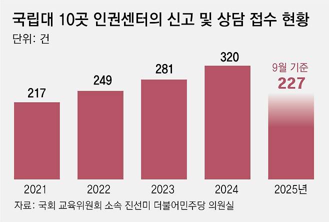 서울대 등 국립대 10곳이 국회 교육위원회 진선미 더불어민주당 의원실에 29일 제출한 ‘최근 5년간 인권센터 사건 현황’에 따르면 국립대 인권센터에 접수된 신고 및 상담 건수는 매년 증가하는 추세다. △2021년 217건 △2022년 249건 △2023년 281건 △2024년 320건이었다. 올해는 지난달 기준 227건으로 이미 지난해 건수의 절반을 넘었다.